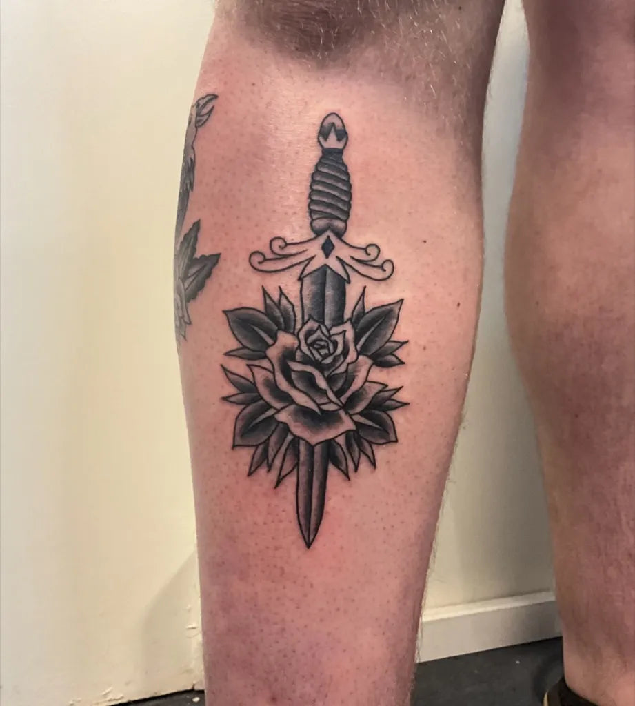 Medium American Traditional Dagger and Rose Tattoo on Men Leg by @cacticami