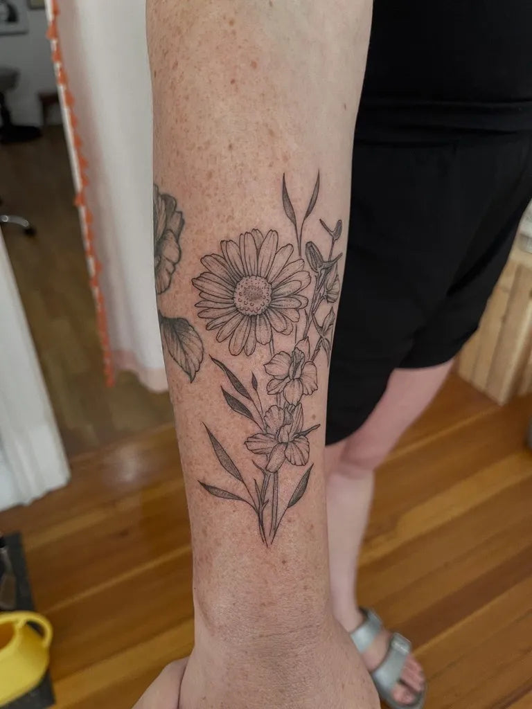 Medium Black and Grey Daisy and Gerbera Tattoo on Women Arm by @helloscoutie