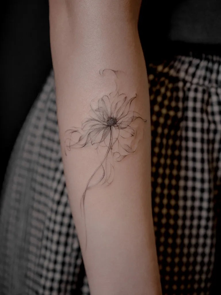 Small Fine Line Daisy with Petals Women Arm by @peria_tattoo