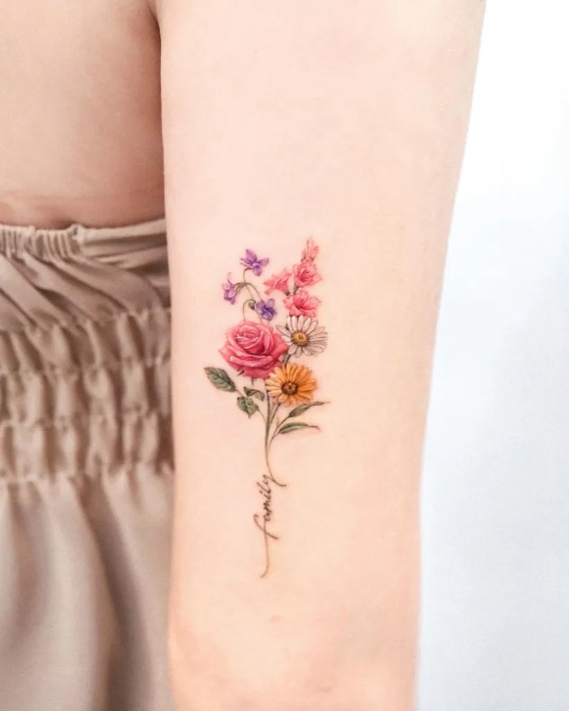 Small Fine Line Flower Bouquet with Daisy Tattoo on Women Arm by @palette.tt
