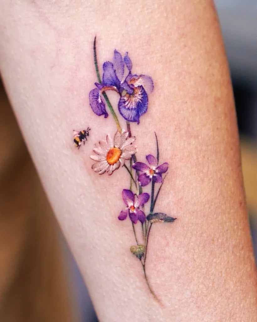 Small Fine Line Iris Daisy Bee Tattoo on Women Arm by @abii_tattoo