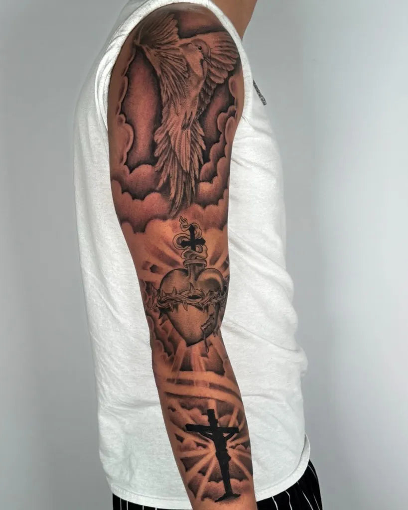 Big Black and Grey Sacred Heart Dove Cross Tattoo on Men Arm by @logan_brewer