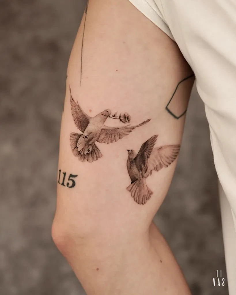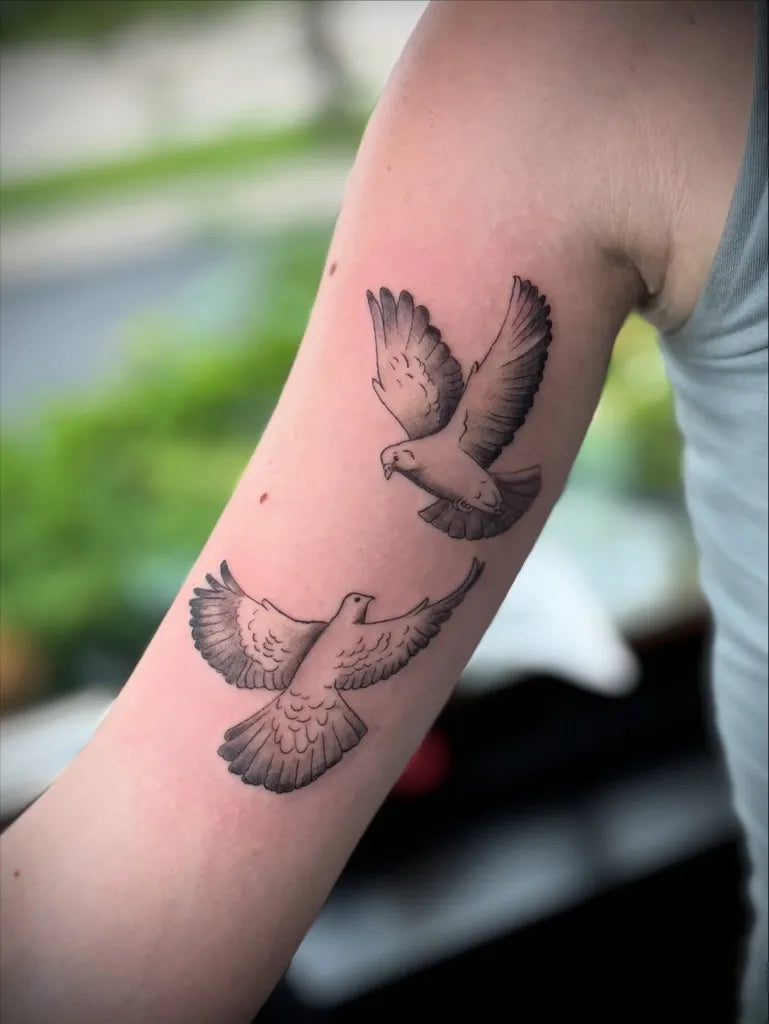 Medium Black and Grey Two Doves Tattoo on Men Arm by @gabi_fenginktattoos
