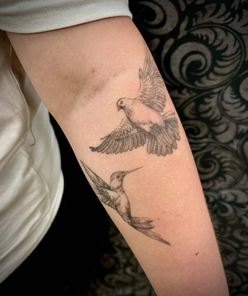 Medium Black and Grey Dove and Hummingbird Tattoo on Women Arm by @docdavetattoos