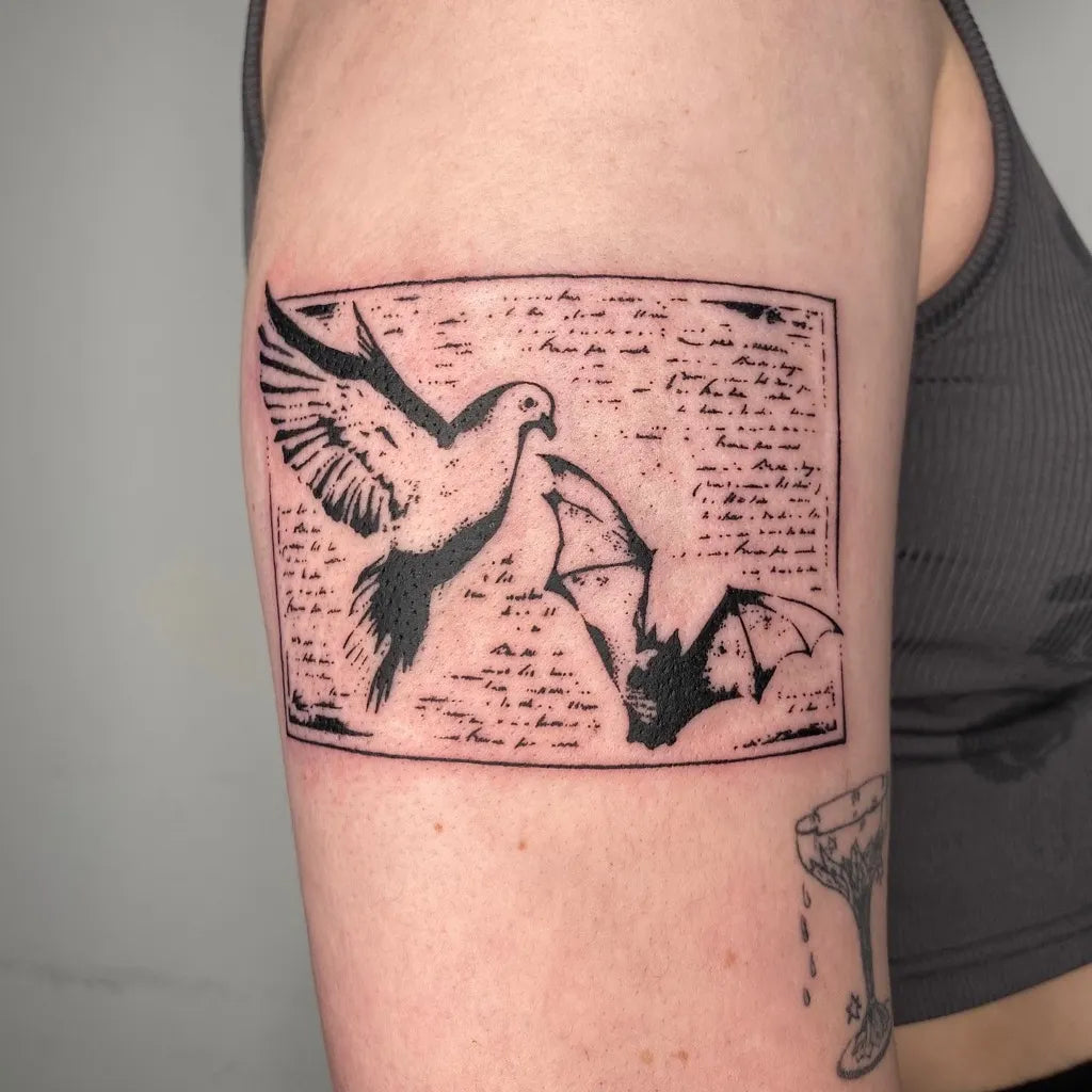 Medium Blackwork Dove and Bats Tattoo on Women Arm by @darkfaetattoo
