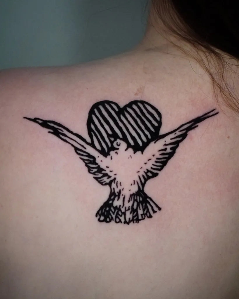 Medium Blackwork Dove with Striped Heart Tattoo on Women Shoulder by @tillwest.ttt