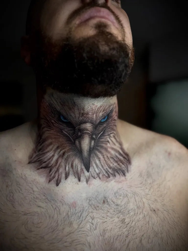 • Realism/black and gray: Detailed feathers, intense eyes, and dramatic motion.