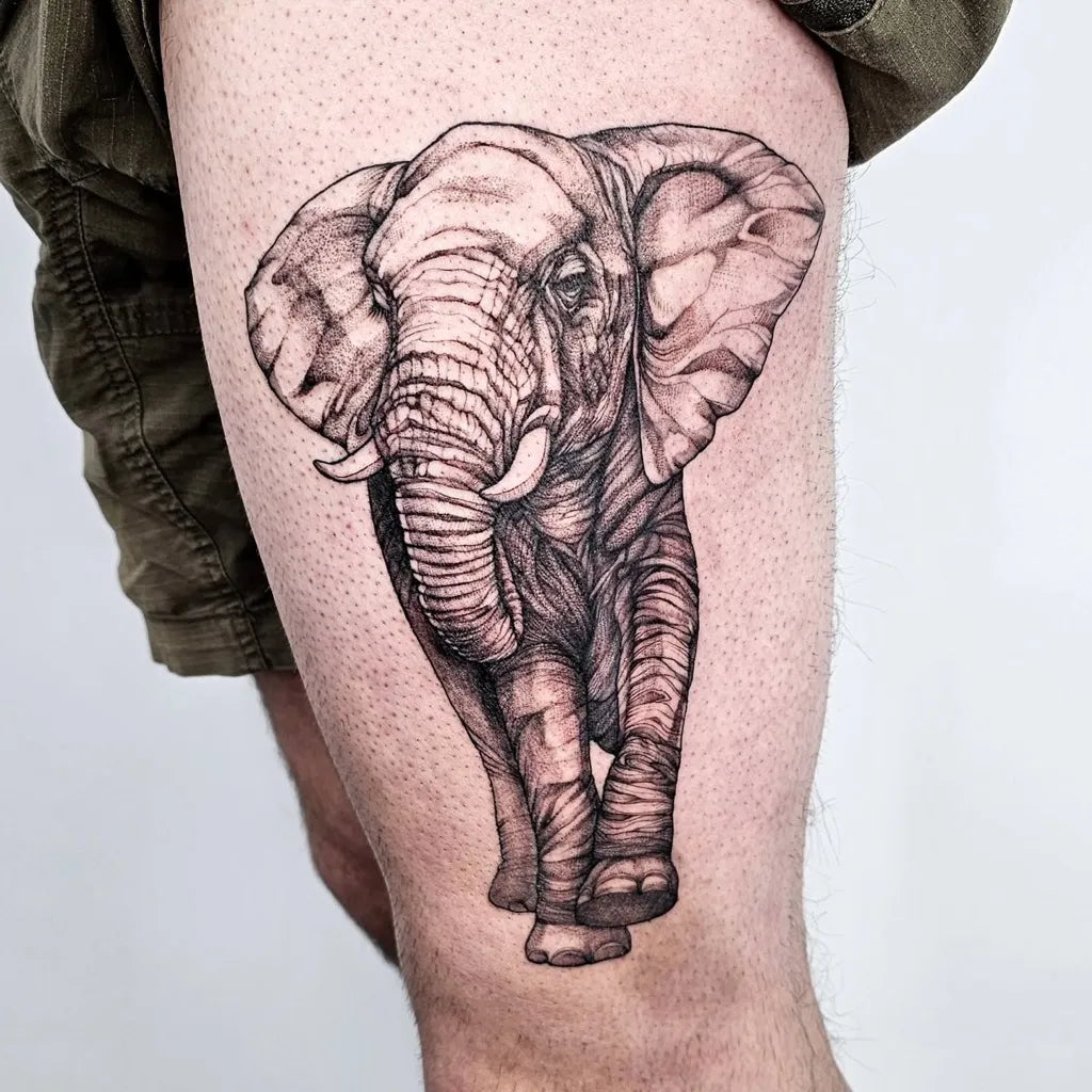 - Realism/black and gray: Detailed textures—wrinkles, tusks, and soulful eyes for dramatic depth.