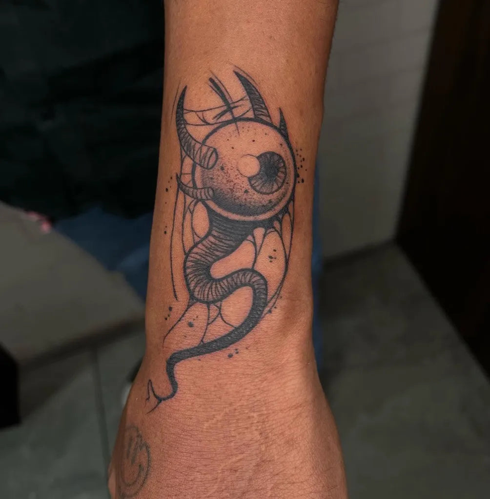 Small Blackwork Evil Eye with Spiderweb on Men Arm Tattoo by @sachinnthokal