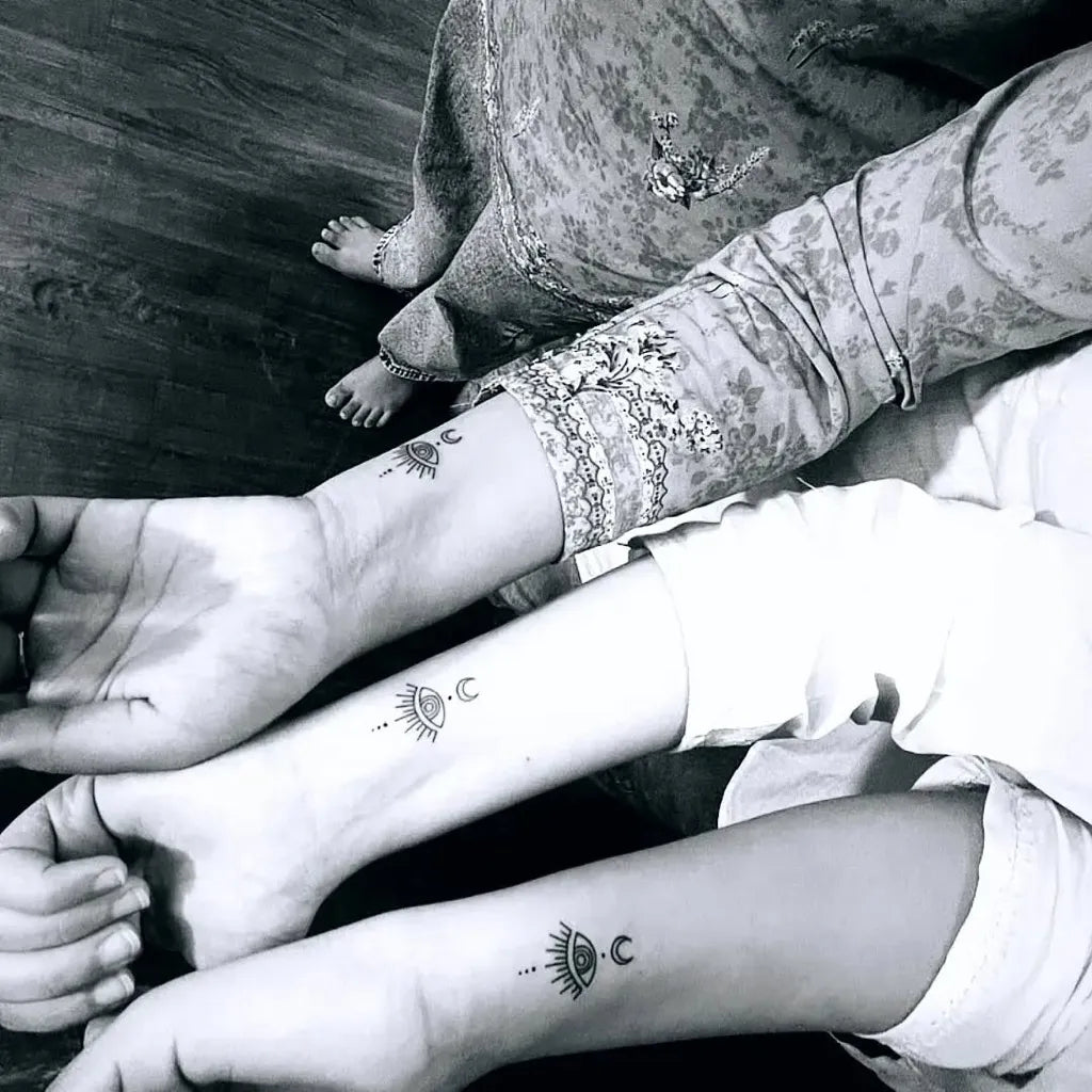 Small Matching Evil Eye Moon Symbol on Women Wrist Tattoo by @vijaytattooartist