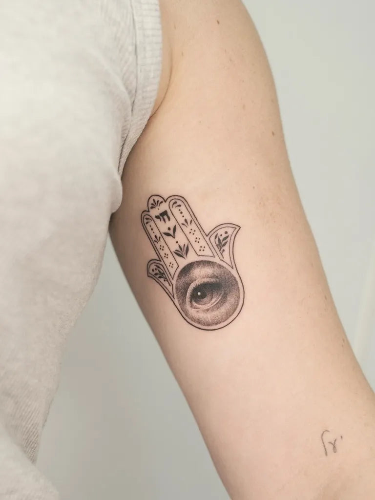 Small Black and Grey Hamsa Evil Eye on Women Arm Tattoo by @lonewolf_studio