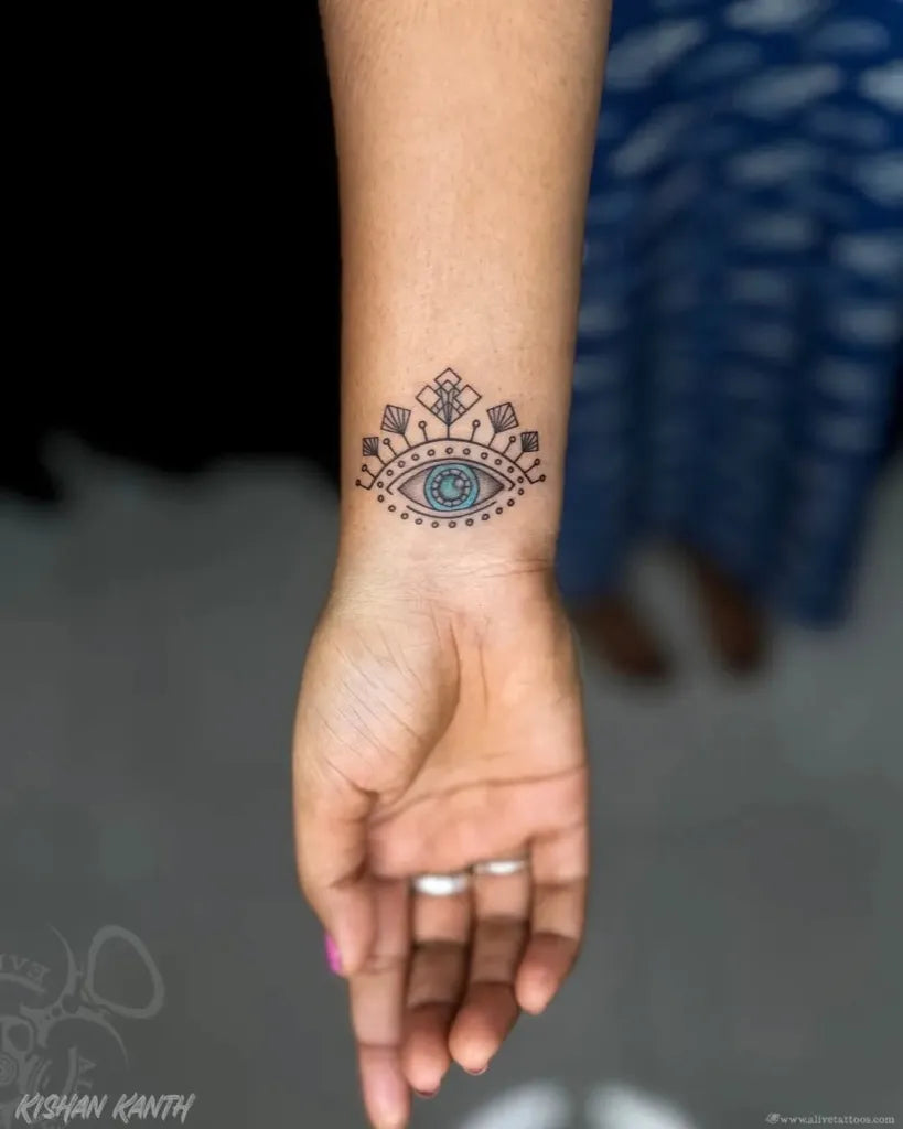 Small Fine Line Evil Eye on Women Wrist Tattoo by @rr_ink_tattoo_cherpulassery