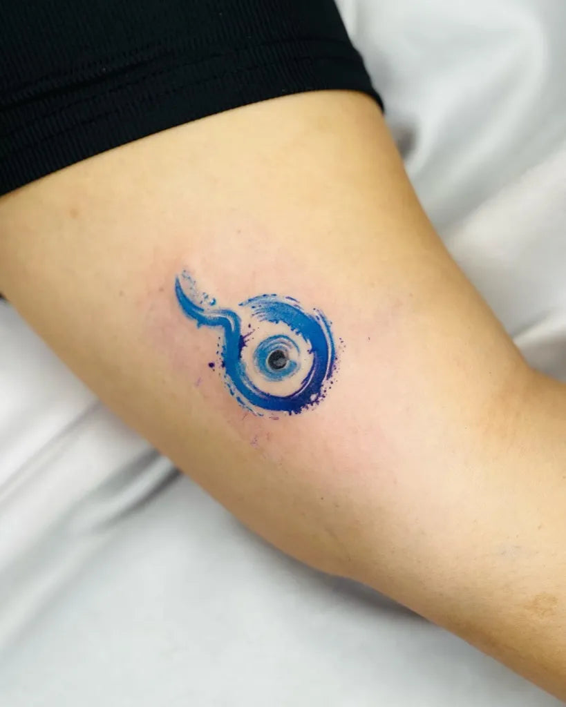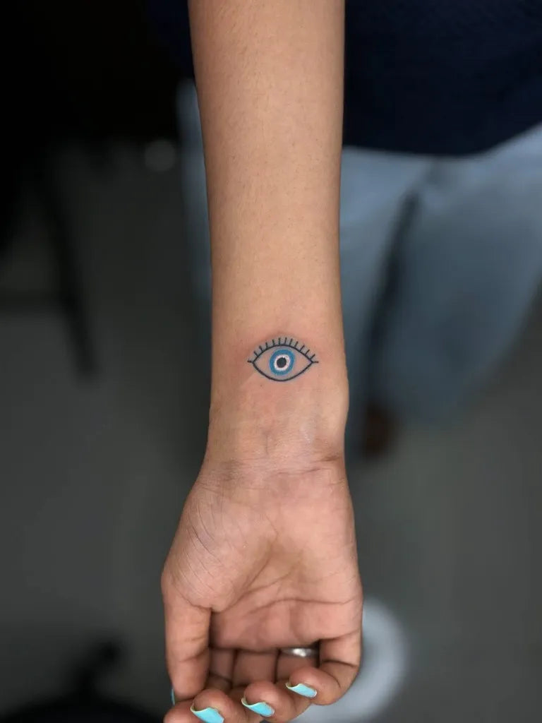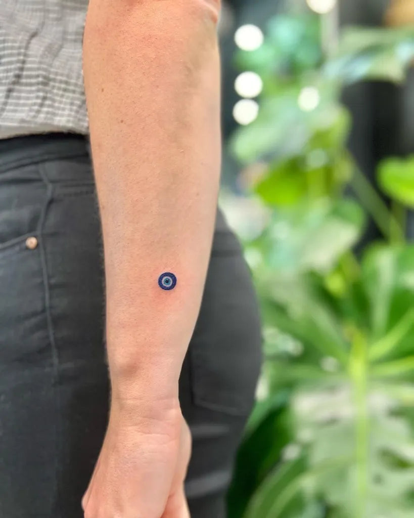 Small Watercolor Evil Eye on Women Arm Tattoo by @riseinktattoo_and_nailart