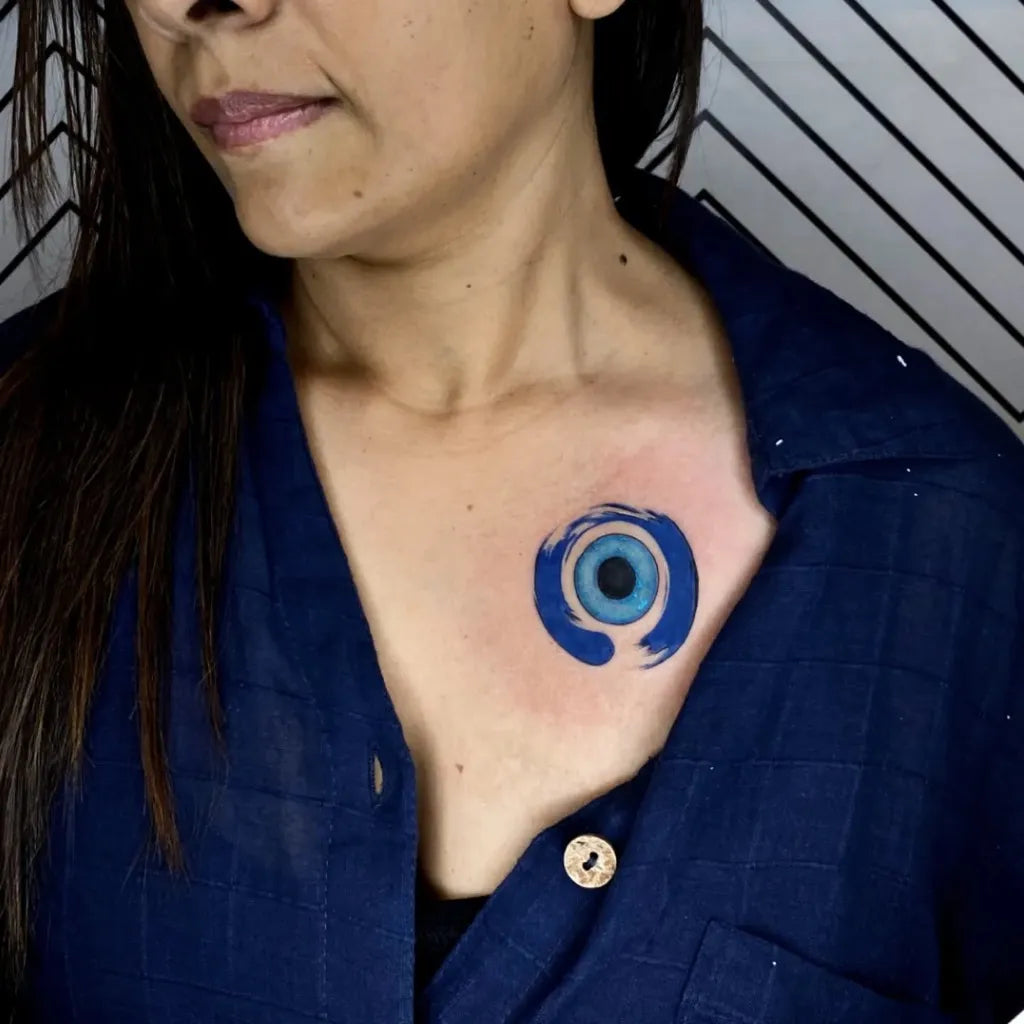 Small Watercolor Evil Eye on Women Chest Tattoo by @mandalistictattoostudio