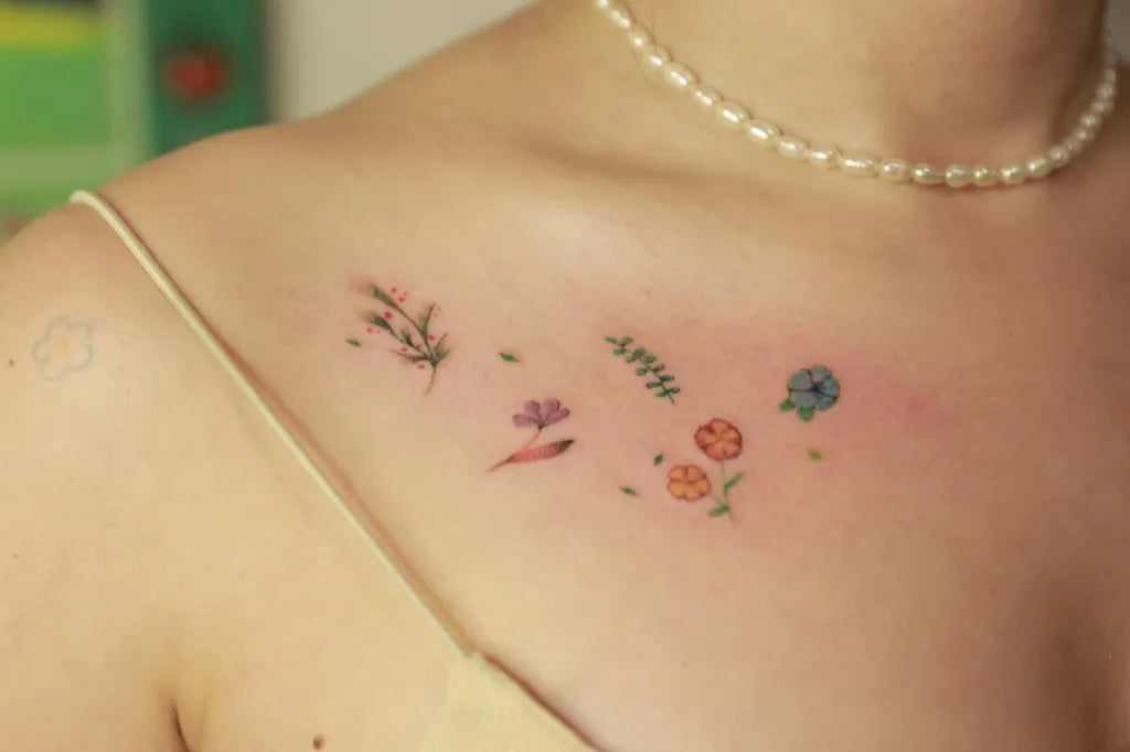 Small Fine Line Botanical Flowers on Women Shoulder Flower Tattoo by @panimeldy