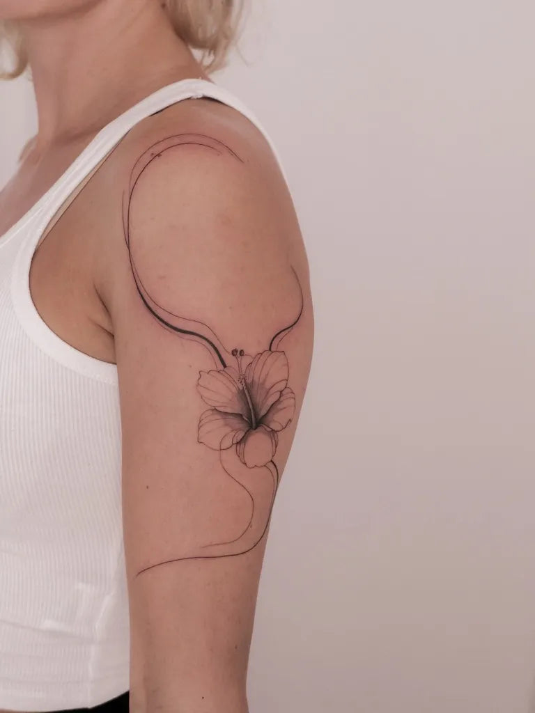 Small Linework Hibiscus Flower on Women Shoulder Tattoo by @kwiatek_tattoo