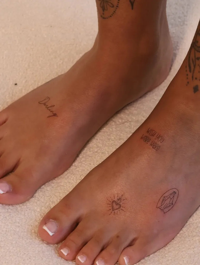 Small Fine Line Quote Tattoo on Women Foot by @dose.of.artistry