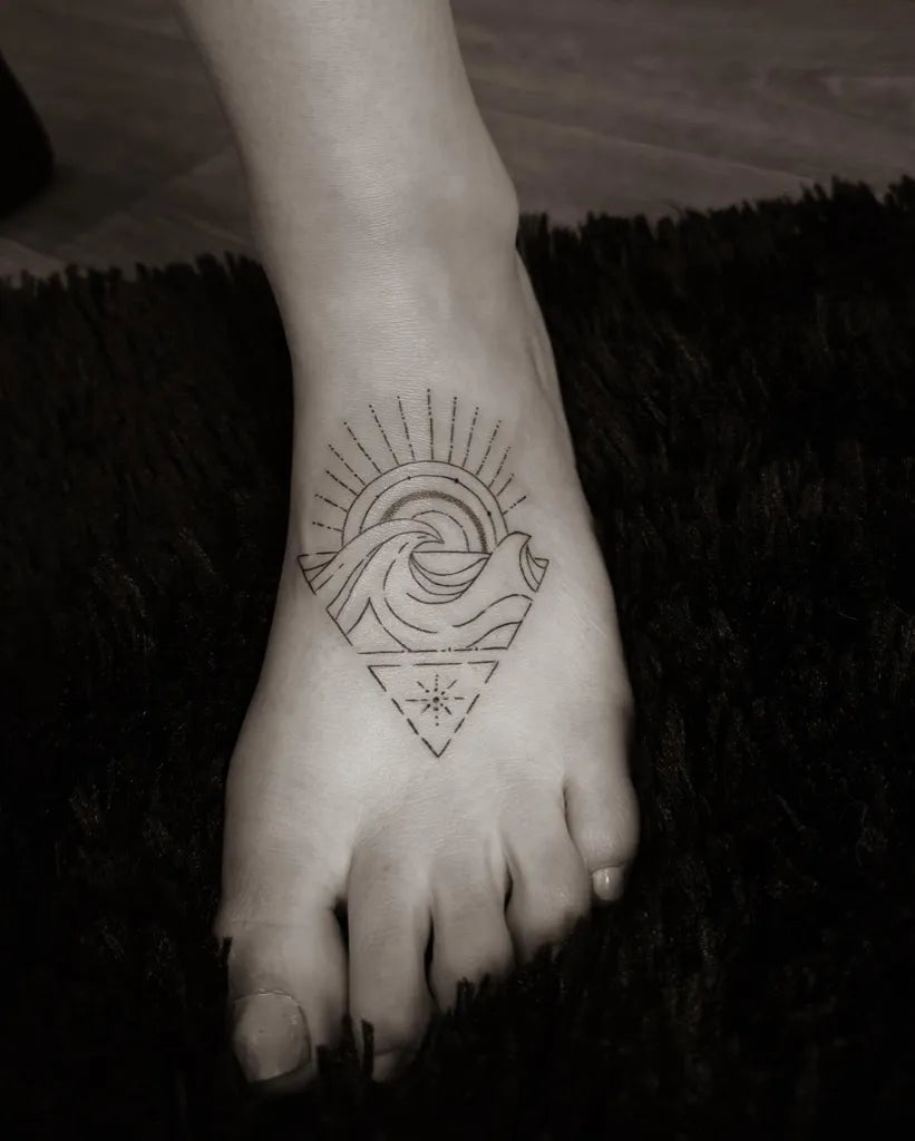 Small Minimalist Sun Wave Triangle Tattoo on Women Foot by @daintygarden.ink