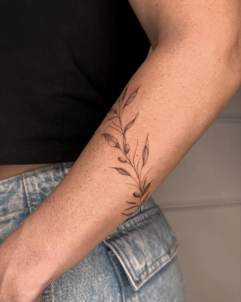 Small Fine Line Olive Branch on Women Forearm Tattoo by @geo.tattoos