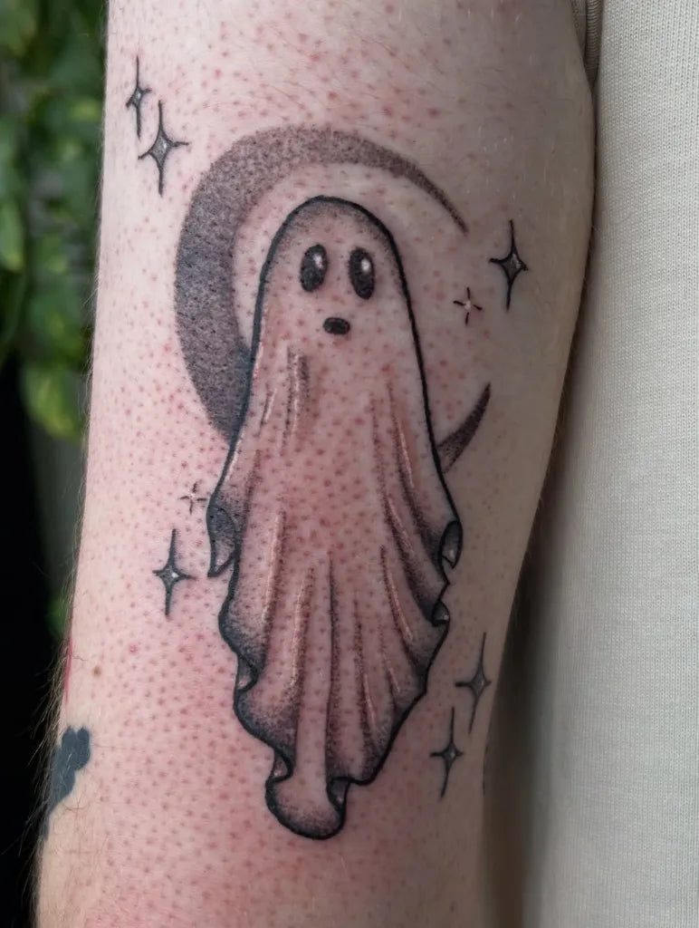 • Personalize your ghost tattoo with celestial symbols, florals, or meaningful script, and choose a placement that fits the vibe—sweet, spooky, or soulful.