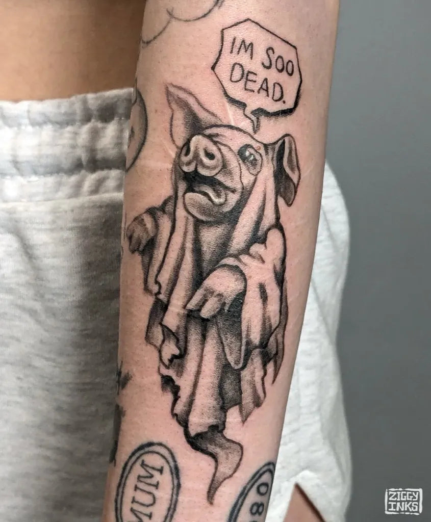 Medium Blackwork Ghost Pig Tattoo on Women Arm by @ziggy.inks