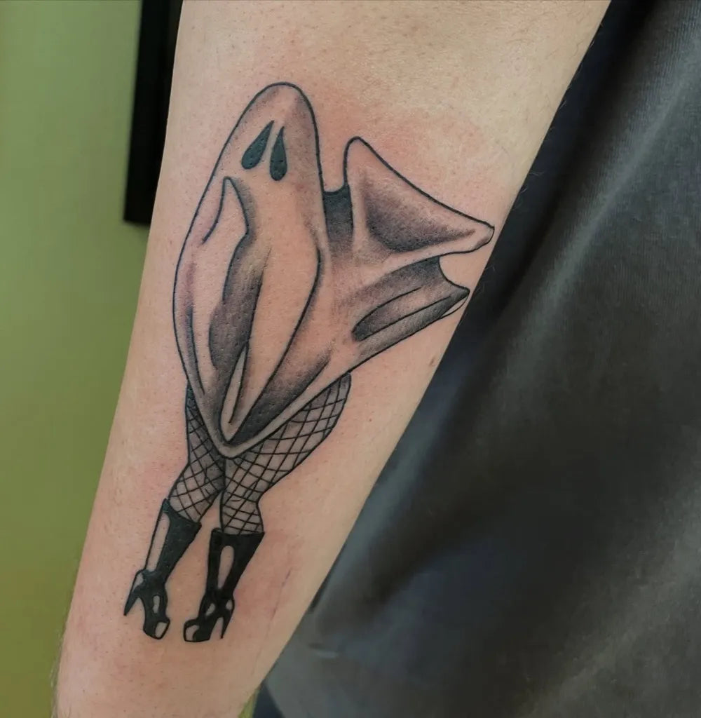 Medium Traditional Ghost Stockings Tattoo on Women Arm by @embry.ink