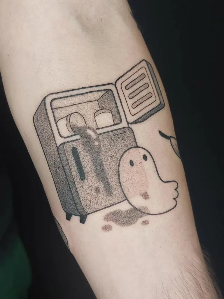 Small Dotwork Microwave Ghost Tattoo on Men Arm by @fulifulitattoo