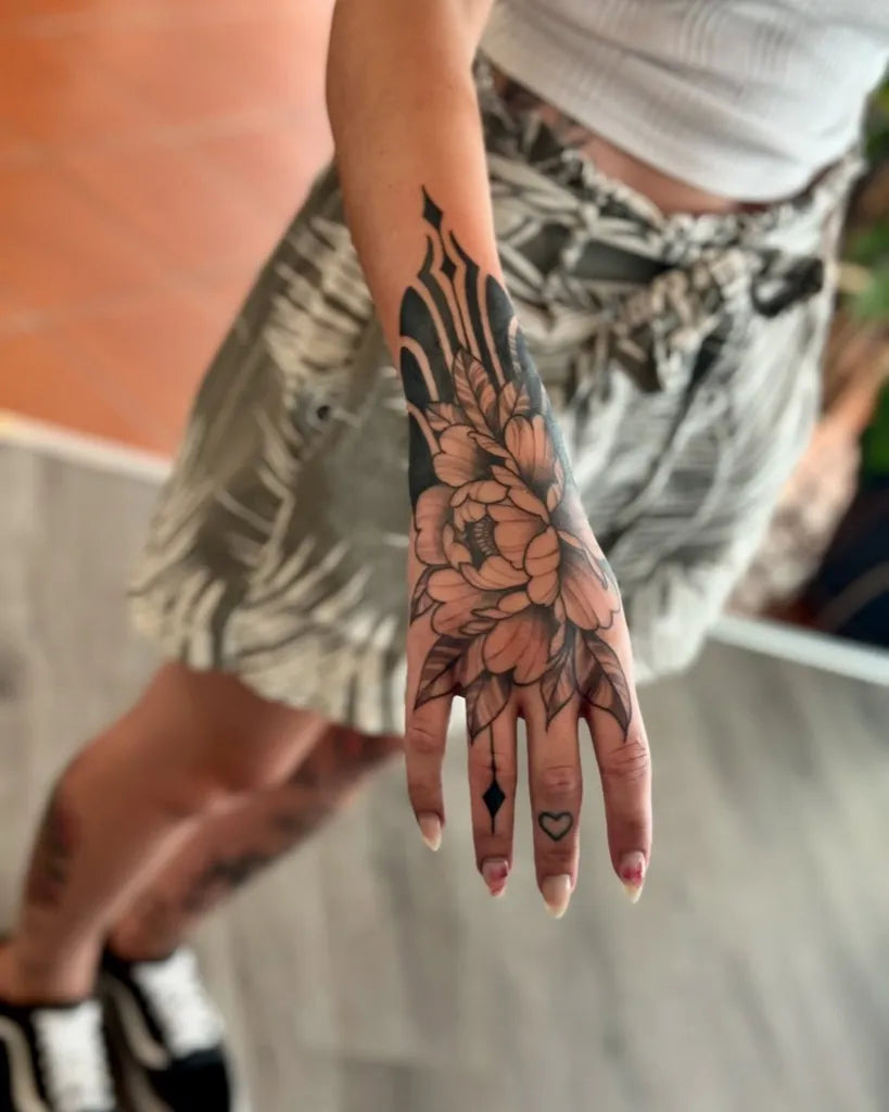Small Blackwork Heart Flowers on Women Hand Tattoo by @needle.mistress