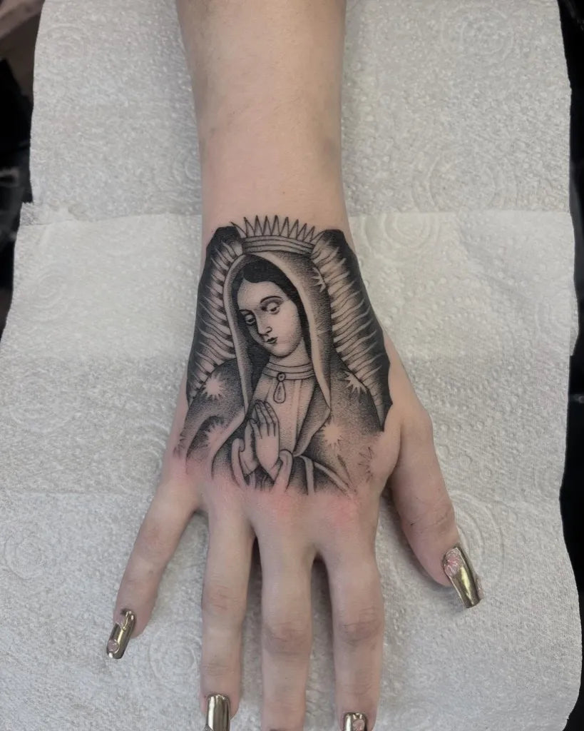 Big Chicano Virgin Mary on Women Wrist Tattoo by @skil_mitchell