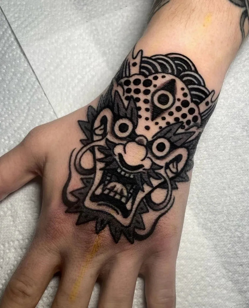 Big Traditional Hannya Mask on Men Hand Tattoo by @goodfortunestudio