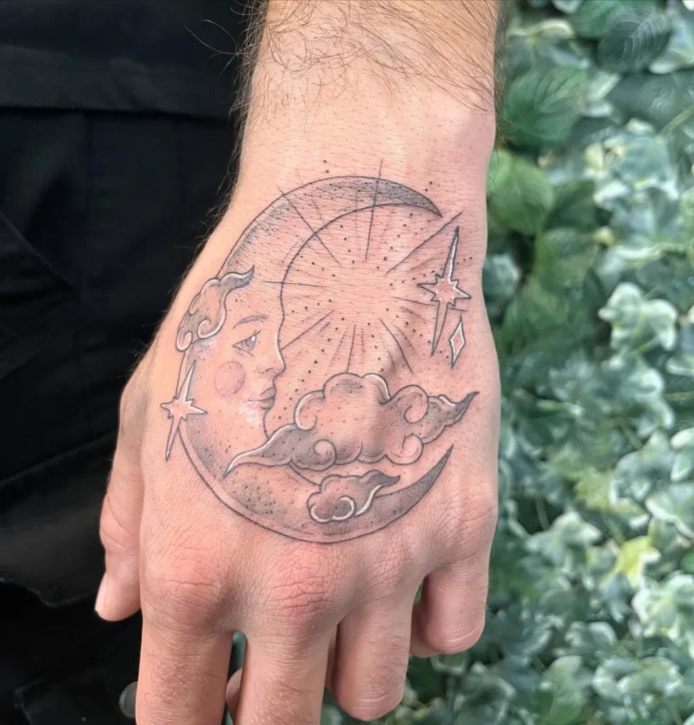 Small Minimalist Moon Stars Love on Women Hand Tattoo by @tavi_tattoo