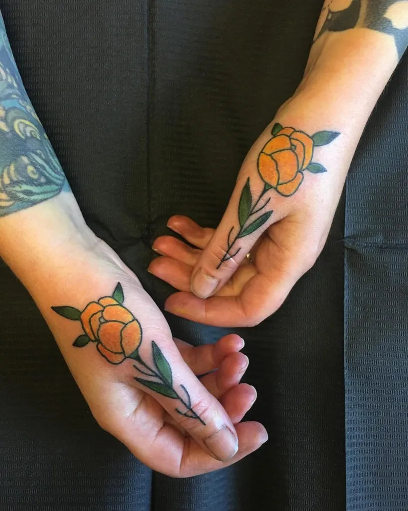 Small Neotraditional Orange Rose with Stem on Women Hands Tattoo by @sthlmclassictattoo