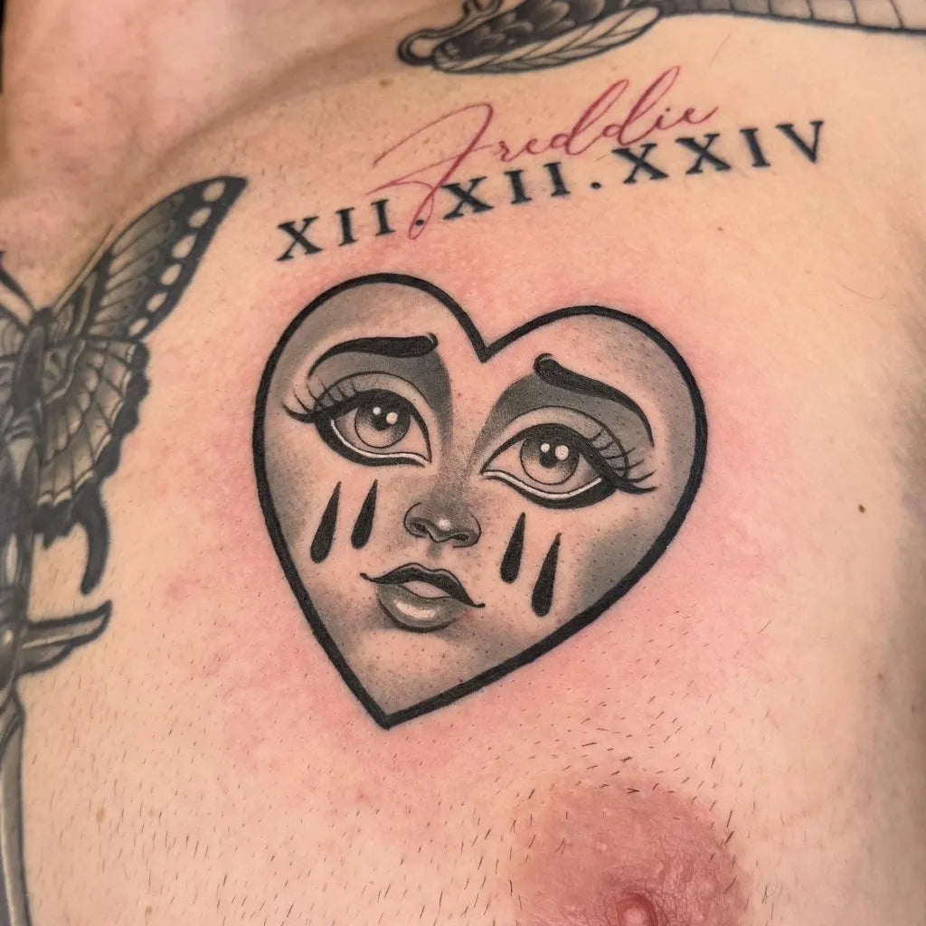 Medium Neotraditional Crying Heart on Men Chest Tattoo by @babyknowles