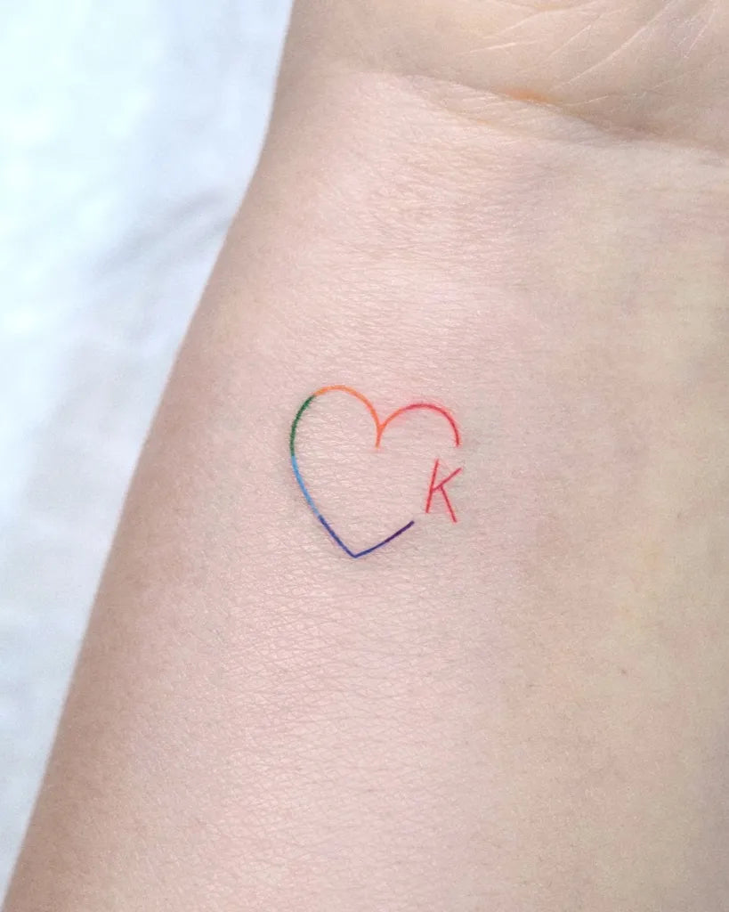 Tiny Linework Rainbow Heart with K on Women Wrist Tattoo by @ziv_tattooer