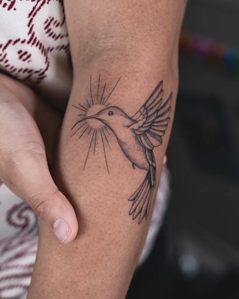 Small Black and Grey Hummingbird with Sun on Women Arm Tattoo by @inkykimi