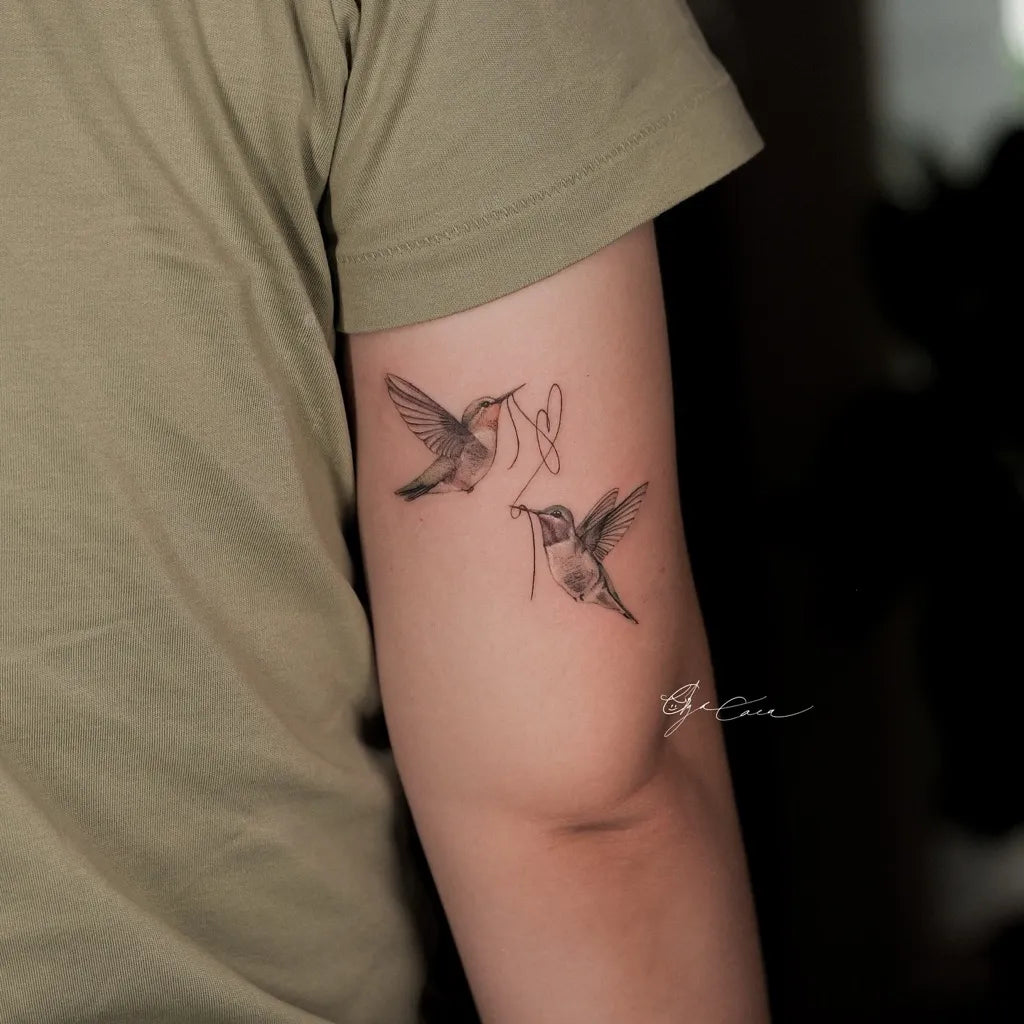 Small Fine Line Two Hummingbirds on Women Arm Tattoo by @cinthya_tattoos