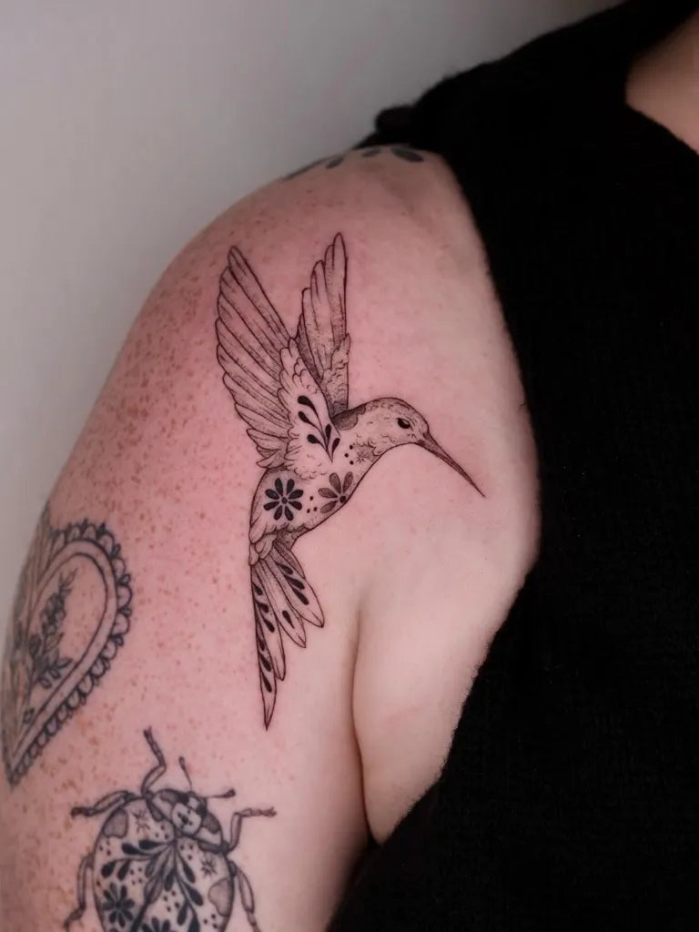 Small Blackwork Hummingbird with Flower and Ladybug on Women Shoulder Tattoo by @the.ouroboros.tattoo
