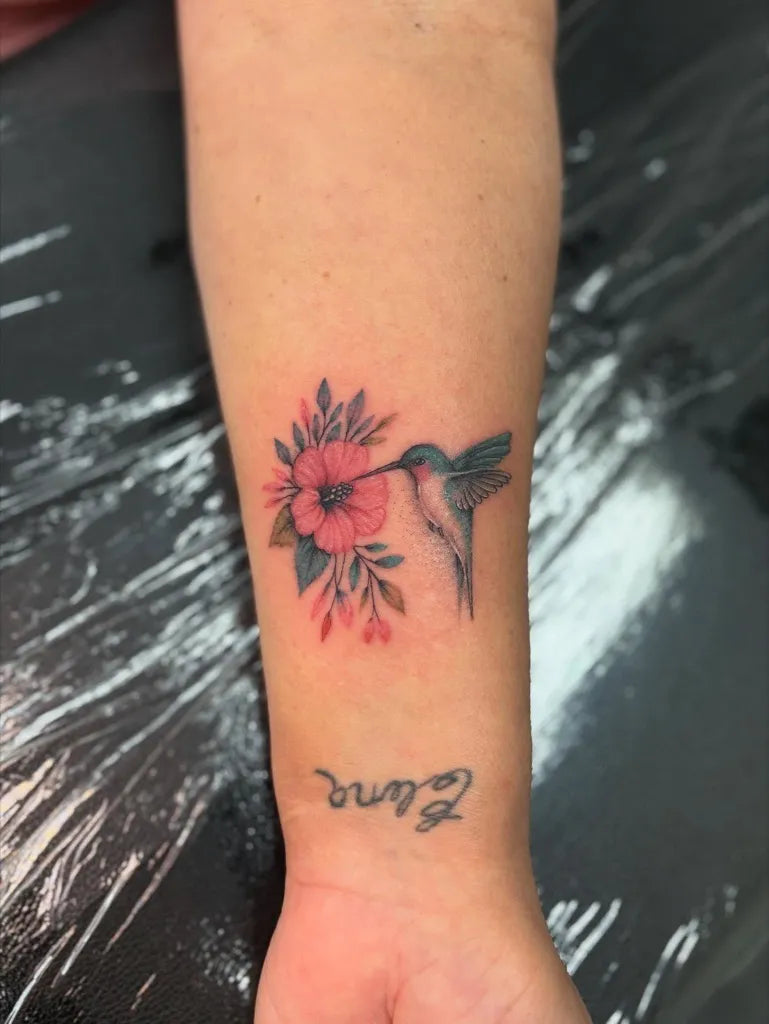 Medium Realism Hummingbird and Hibiscus Flowers on Women Arm Tattoo by @the.hancock.effect