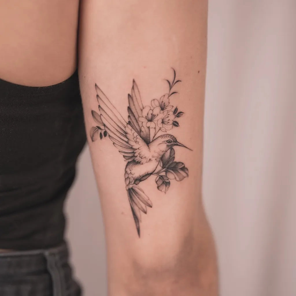 Medium Black and Grey Hummingbird and Flowers on Women Arm Tattoo by @ayons_finest_ink