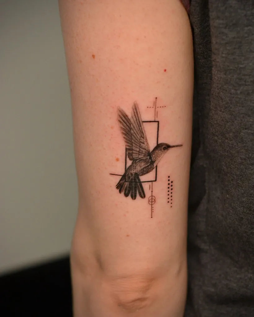 Small Minimalist Hummingbird with Geometric Frame on Women Arm Tattoo by @rimatattoo