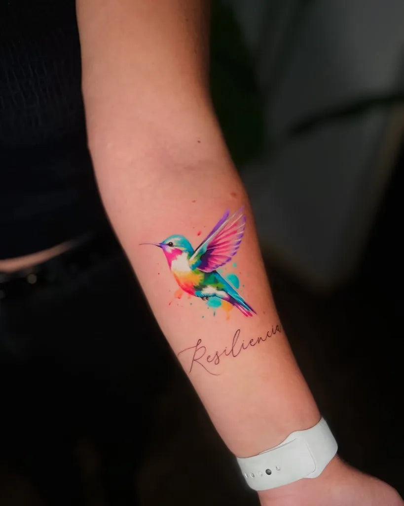 Small Watercolor Hummingbird on Women Arm Tattoo by @claudiogajardo.art