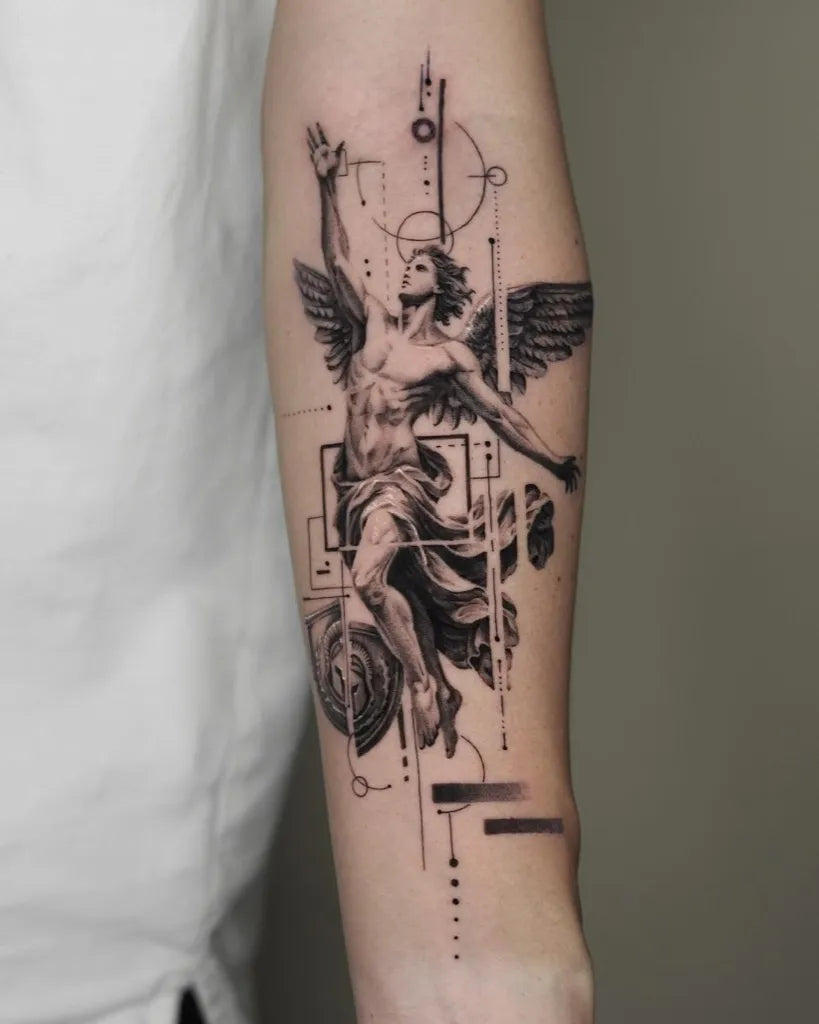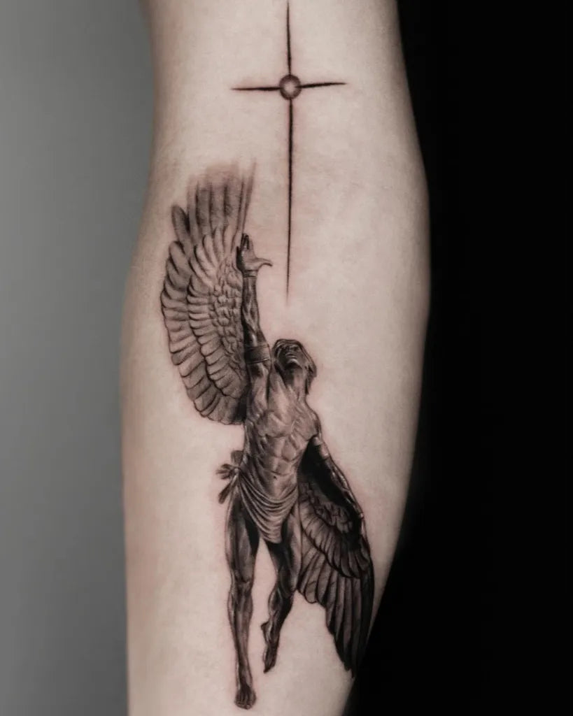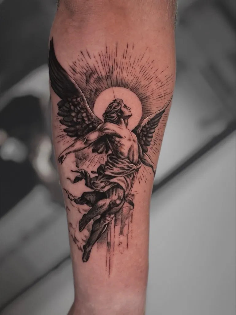 • Minimal or fine-line: Simple silhouette of a falling or flying figure for a subtle, poetic take on the myth.