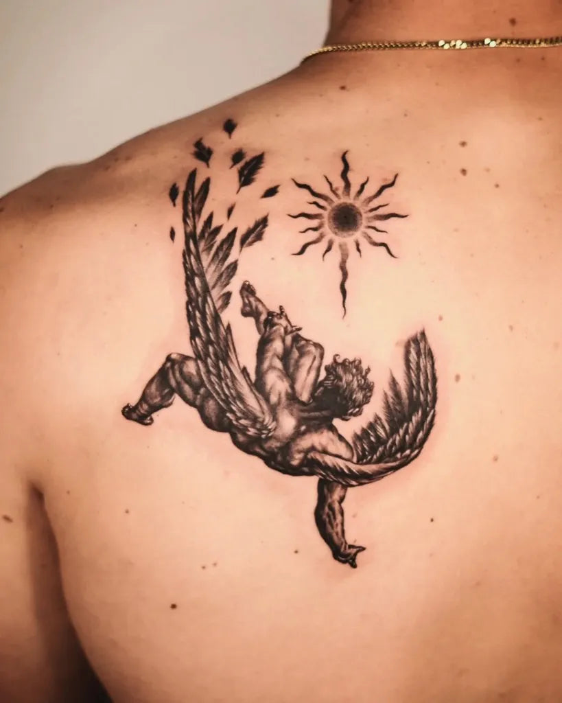 An Icarus tattoo draws on the ancient Greek myth of Daedalus and Icarus to explore ambition, freedom, and the consequences of hubris. In the story, Icarus escapes Crete with wax-and-feather wings but flies too close to the sun, falls, and drowns—an unforgettable image that makes an Icarus tattoo rich with layered symbolism.