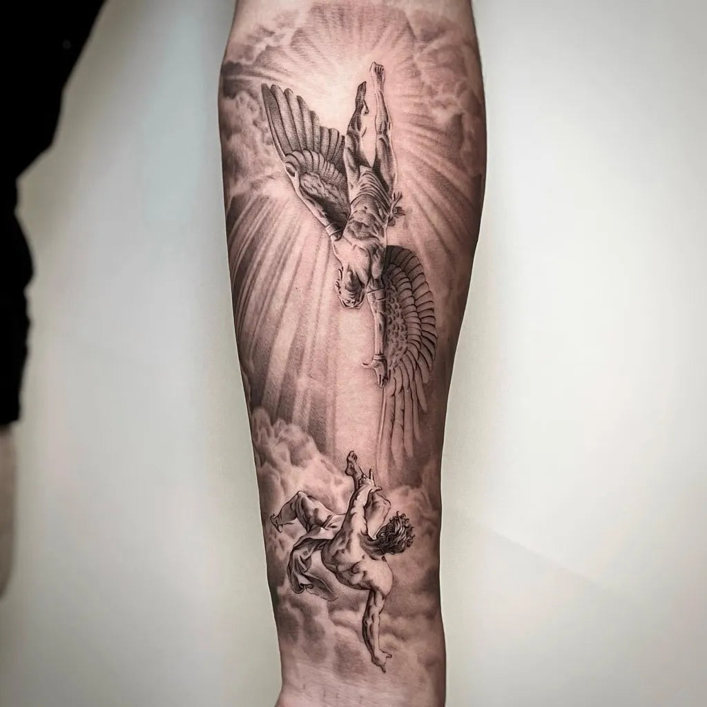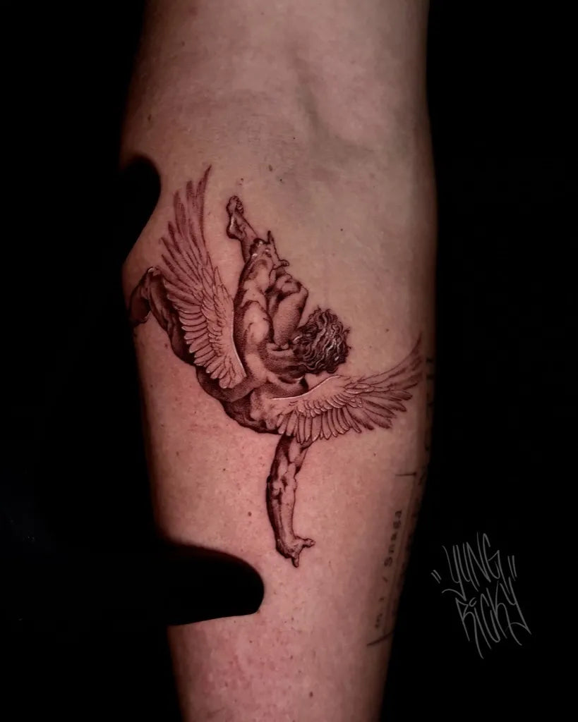 Big Black and Grey Icarus and Angel on Men Arm Tattoo by @min.ink