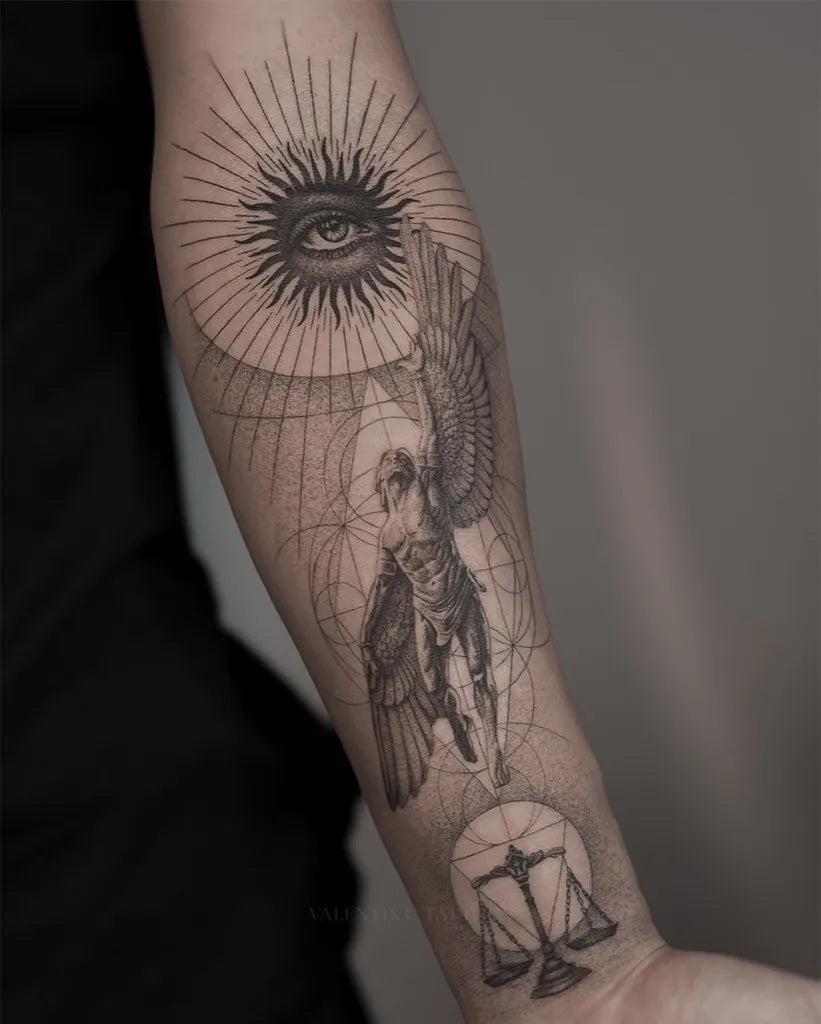 Big Geometric Icarus with Eye and Wings on Women Arm Tattoo by @mireu_ink
