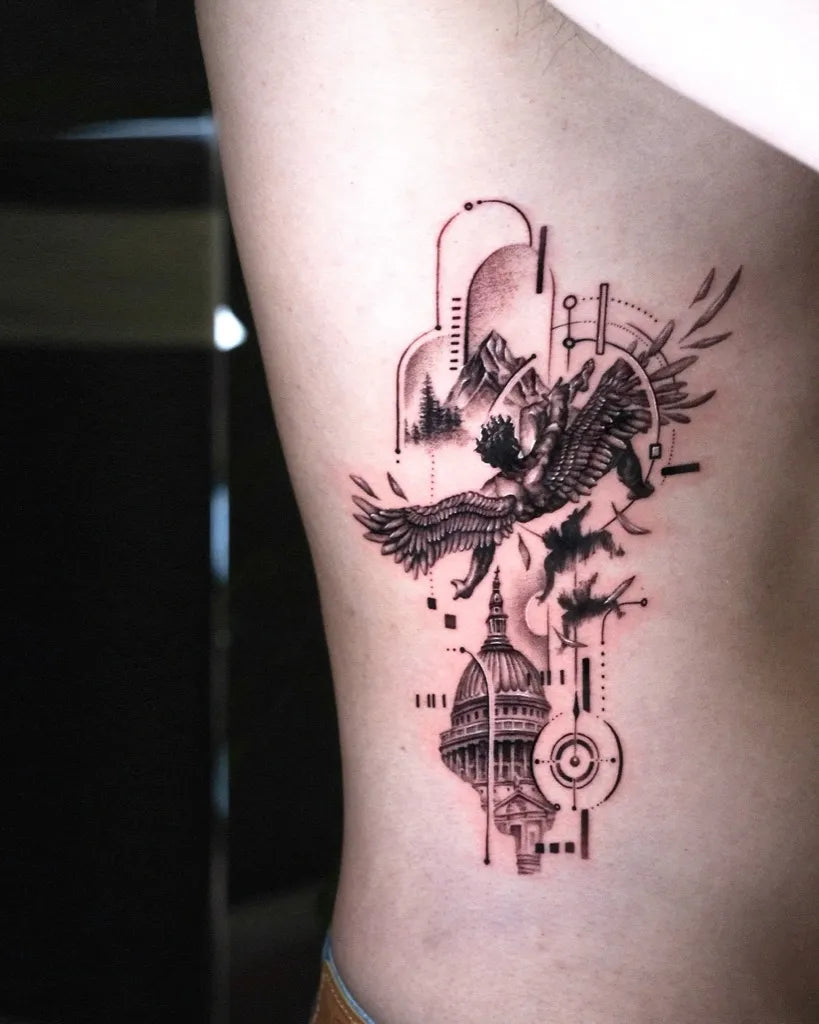 Big Neo Traditional Icarus with Eagle and Capitol on Men Rib Tattoo by @deos__tt