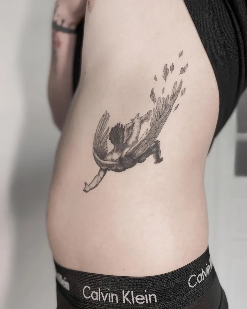 Medium Black and Grey Icarus with Falling Wings on Men Rib Tattoo by @_binkk_