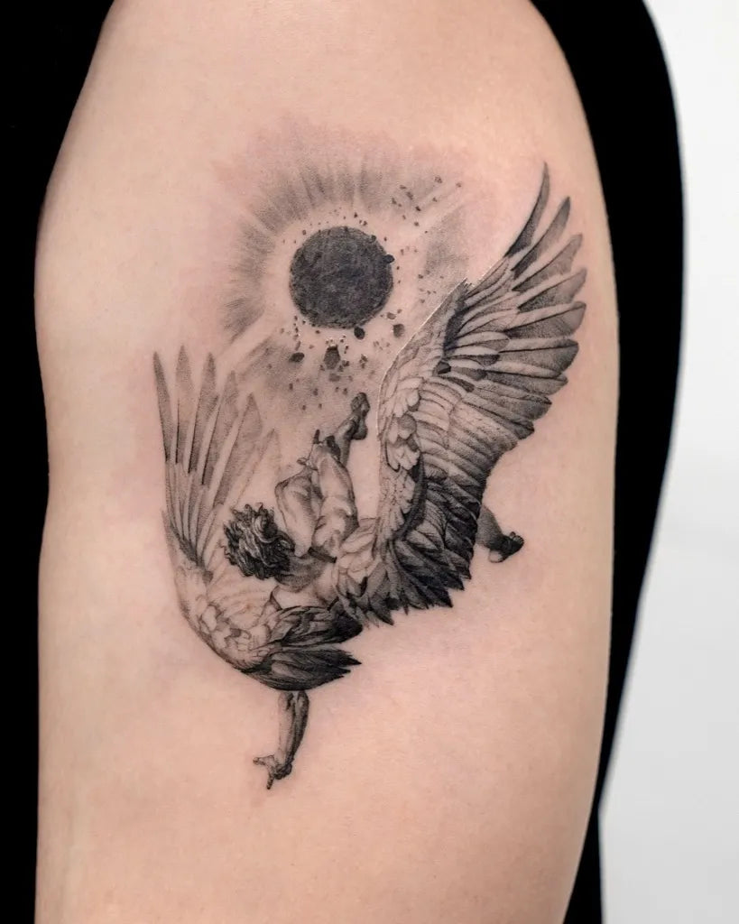 Medium Black and Grey Icarus with Sun and Wings on Men on Upper Arm Tattoo by @start.your.line