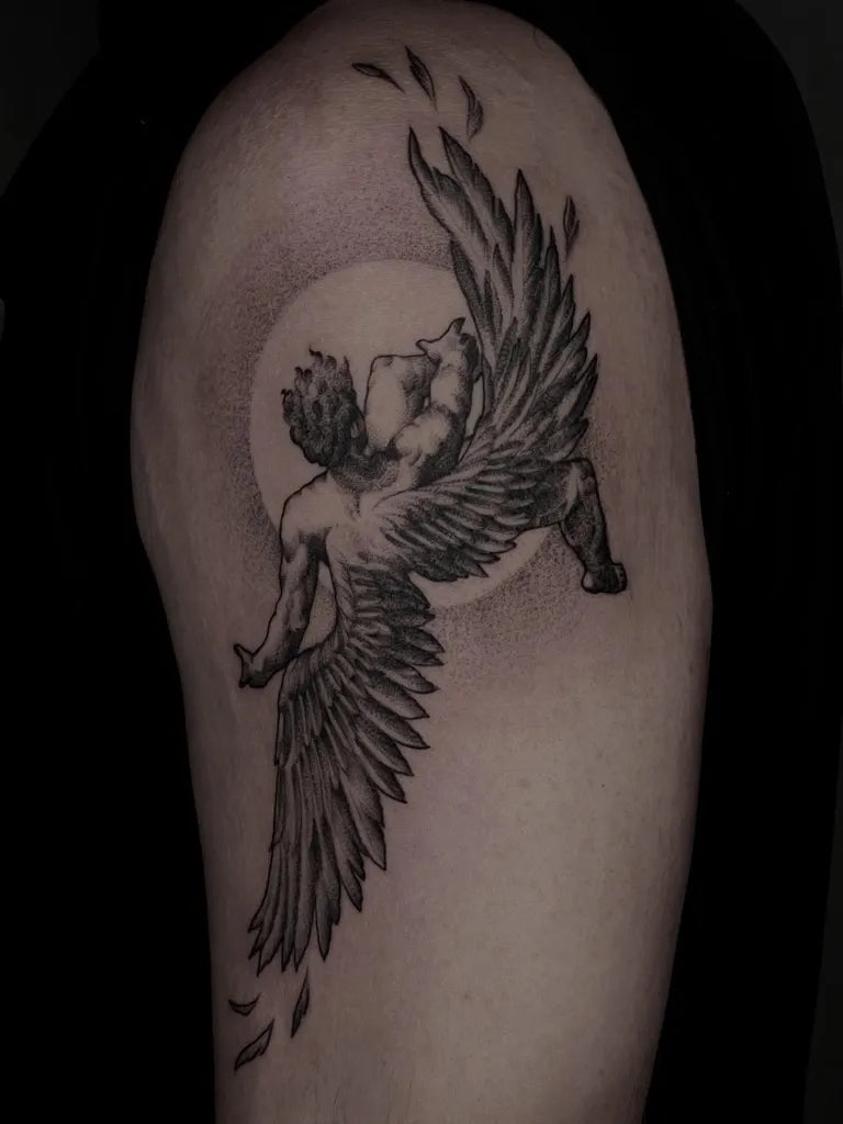 Medium Black and Grey Icarus with Wings on Women Shoulder Tattoo by @dionne.tattoo