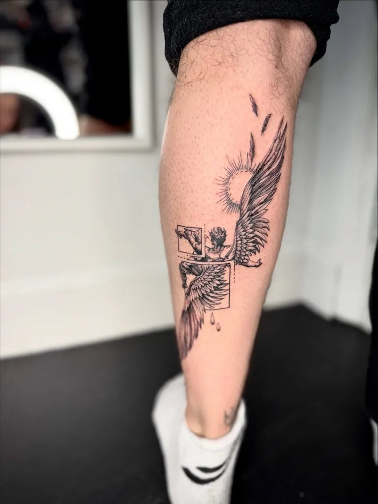 Medium Black and Grey Icarus with Wings on Men Leg Tattoo by @georgilouisetattoos